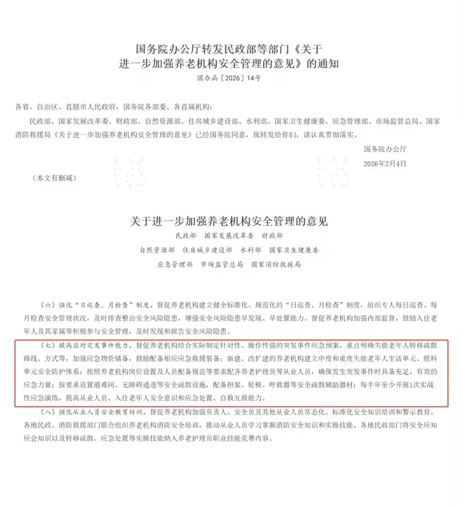 Недавно ряд государственных ведомств совместно опубликовали «Мнения о дальнейшем укреплении управления безопасностью в учреждениях по уходу за пожилыми людьми» (далее — «Новая политика»), обозначив четкий курс для работы в сфере безопасности в секторе ухода за престарелыми на ближайшие три года.